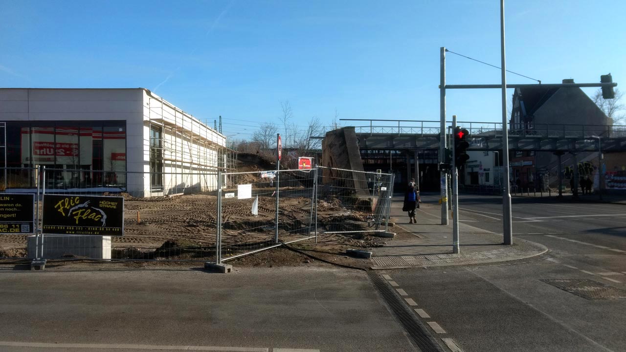 Dort ist in den letzten Wochen zwischen Baumarkt Hellweg und S-Bahnlinie S2 ein Gebäude für einen „Nahversorger“ errichtet worden und hat nun gute Chancen beim Sonderpreis der schnellsten Fehlplanung. Der Bebauungsplan soll erst noch ausgelegt werden. Das von Lucky Luke entworfene Gebäude ist dann aber schon längst fertig und in Betrieb genommen.