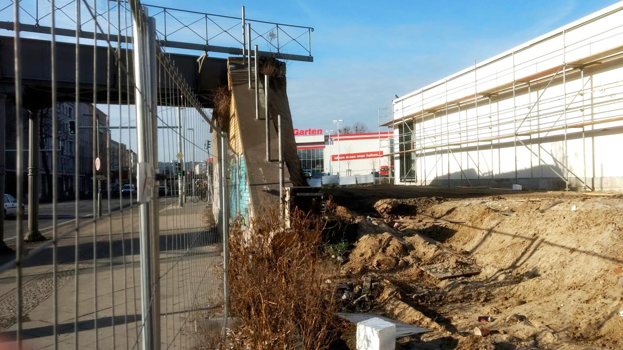 Auch in der Kategorie der nachhaltigsten Fehlplanung ist das Vorhaben preisverdächtig : Die Bilder zeigen, dass das Gebäude etwas zu hoch geworden ist. Wenn tatsächlich einmal der überregionale Fahrrad- und Fußweg über die Yorckbrücke Nr. 5 gehen soll, müsste der Weg hier bergauf gehen. Barrierefreiheit ade. Dies ist nur einer der funktionellen Mängel, die jetzt sichtbar werden. Die Fortsetzung des Weges Richtung Norden in den Westpark des Gleisdreieck funktioniert nicht. Und für die 40.000 Nutzer des ÖPNV, die einmal hier umsteigen sollen zwischen U7, S2/S25/S21 und M19 ist nur ein Miniplatz vorgesehen, eine Schlucht zwischen „Nahversorger“ und Bahndamm.