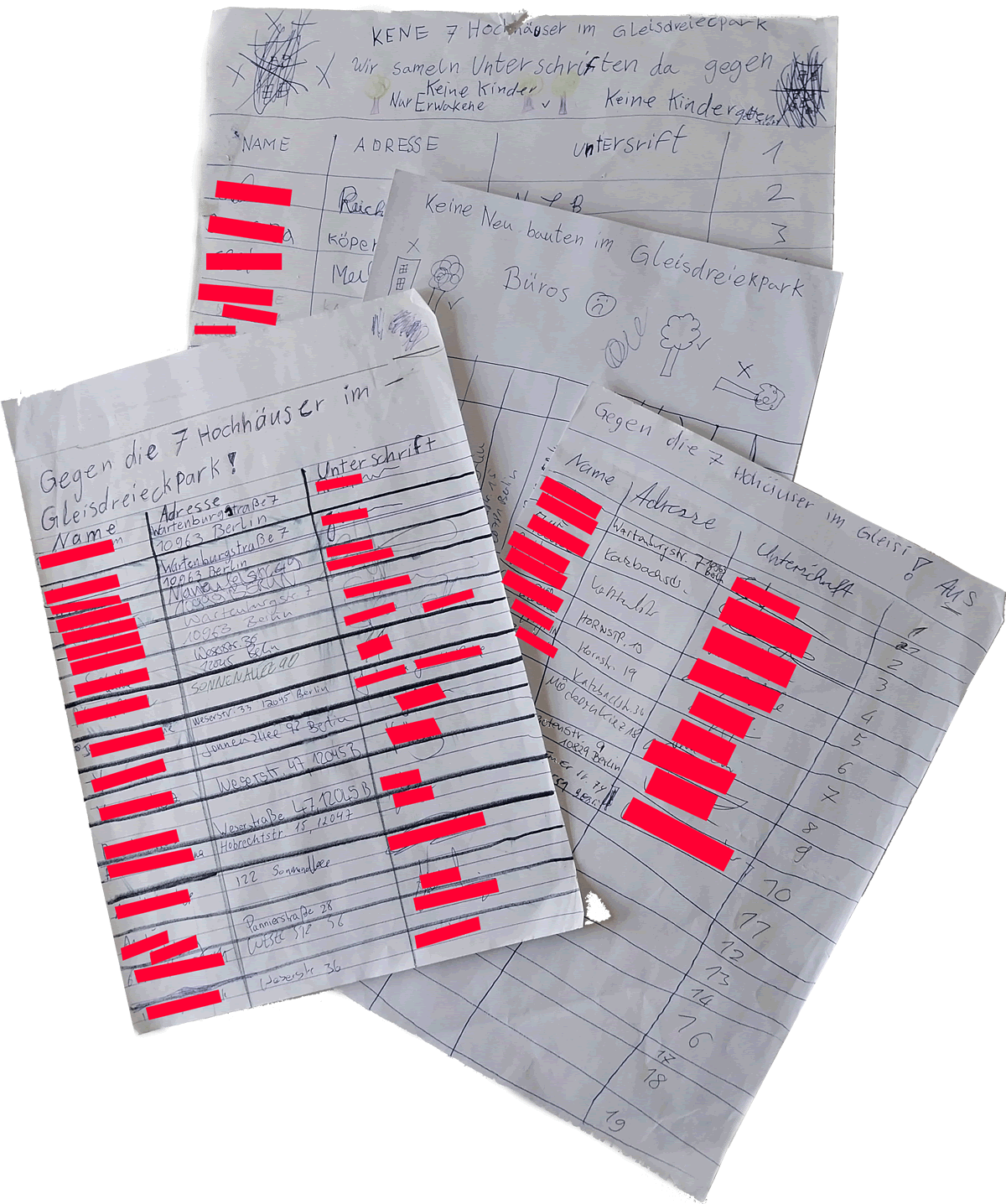 Neben den Spenden werden wir weiter Unterschriften für unsere Petition sammeln. Zwar haben wir am 26. Februar schon einmal die Petition mit 36.371 Unterzeichner:innen im Abgeordnetenhaus übergeben. Aber das ist nur ein Zwischenstand. Hier zu sehen sind 49 Unterschriften, die von Kindern gesammelt wurden. Wir werden sie bei geeigneter Gelegenheit der Politik übergeben, ebenso wie unsere Online-Petition, die weiterläuft.Vielleicht erreichen wir noch die 50.000?