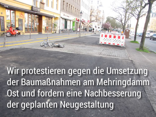 Auf dem Mehringdamm erfolgt ein rücksichtsloser Eingriff in Lebens- und Aufenthaltsqualität sowie Fauna und Flora. Ausgleichsmaßnahmen sind bisher vollkommen unzulänglich.