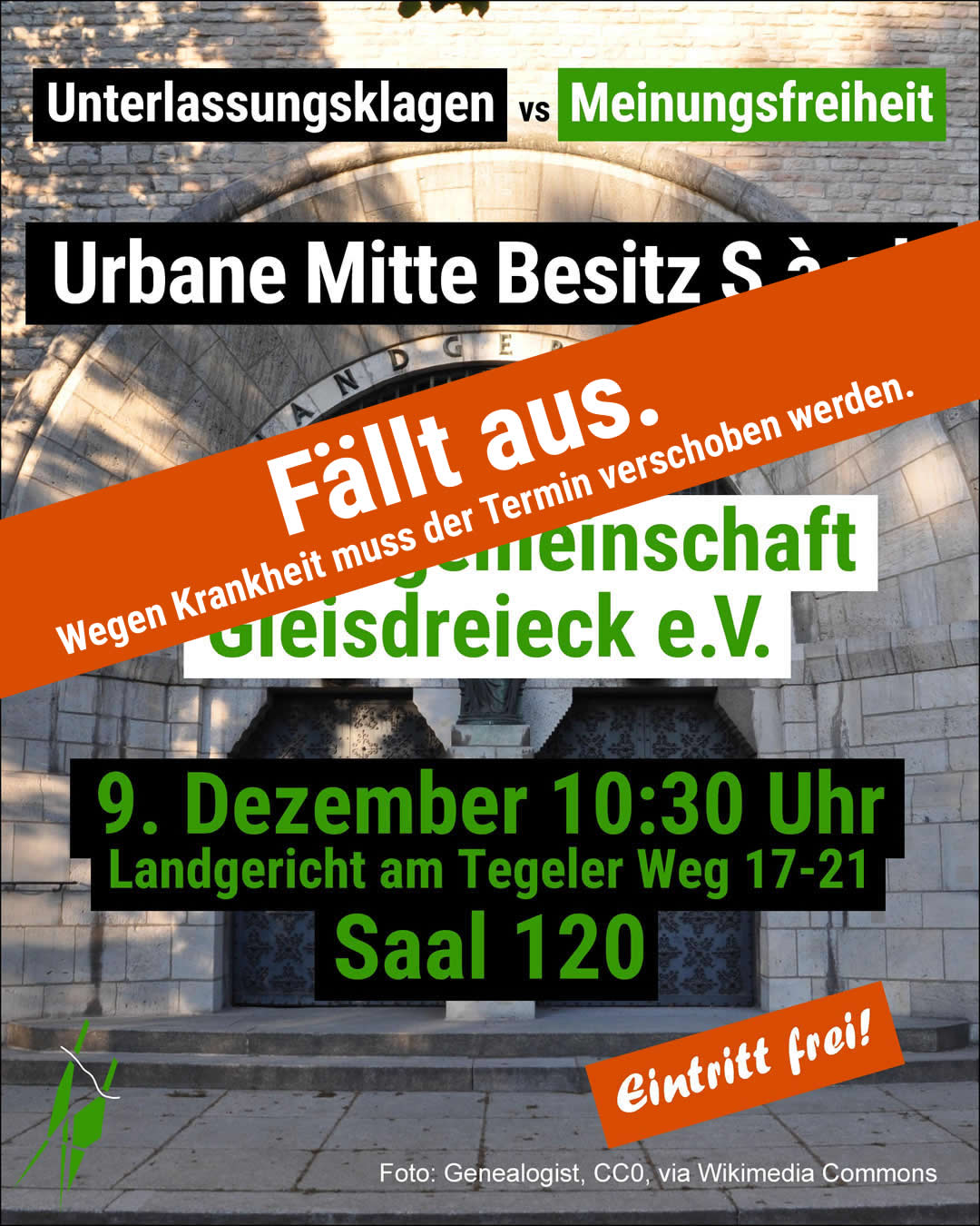 Die Verhandlung der Unterlassungsklage der Urbanen Mitte Besitz S.à.r.l. gegen Matthias Bauer wurde in einen größeren Saal verlegt, um den angekündigten Besuch von Unterstützer*innen Rechnung zu tragen. Die Verhandlung findet nun statt am 13.10.25. um 10 Uhr im Landgericht im Sitzungssaal 105, 1. Etage, Tegeler Weg 17-21, 10589 Berlin. Weiterlesen